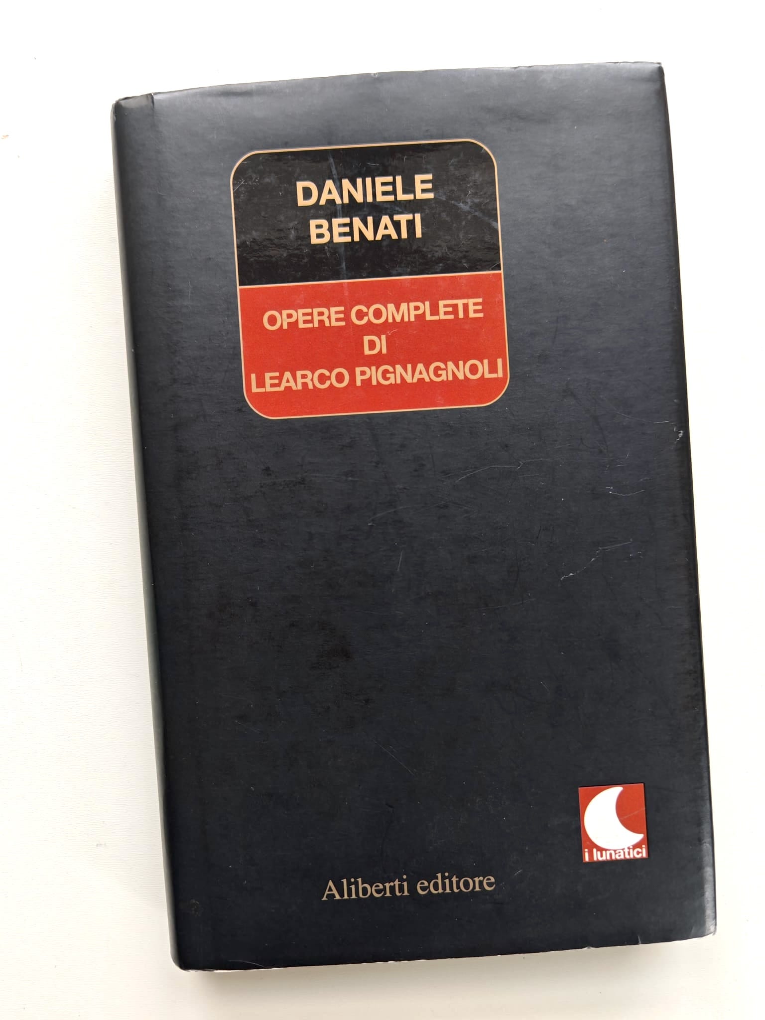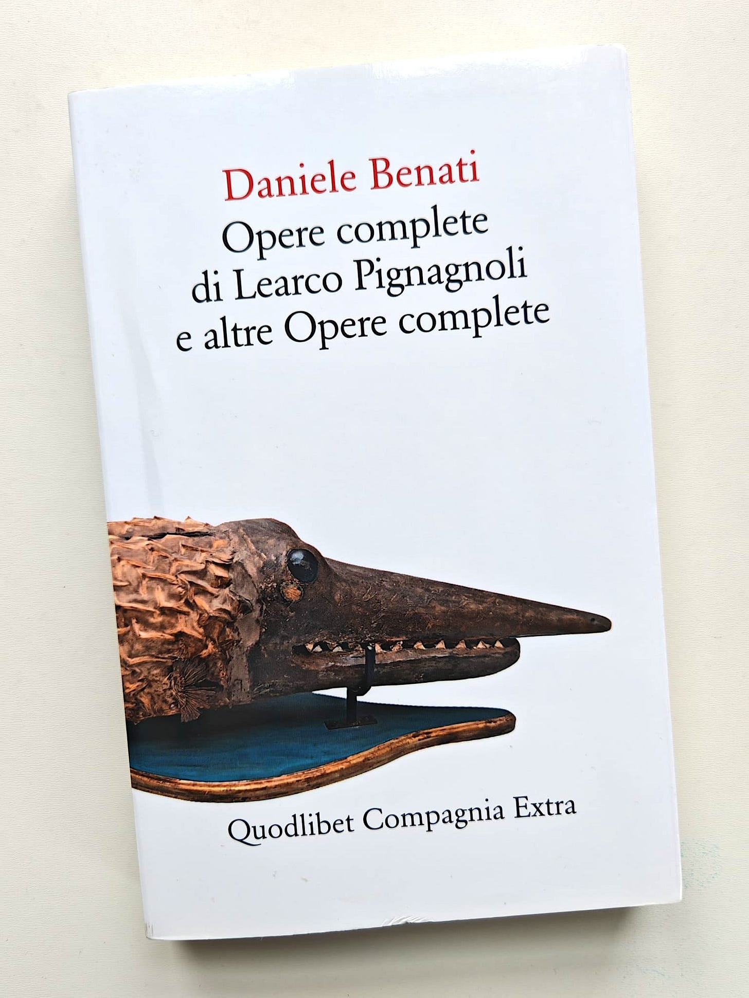 Il libro, se volete andare a controllare, si intitola Opere complete di Learco Pignagnoli, l’ha pubblicato Aliberti nel 2006 e poi ripubblicato Quodlibet nella collana Compagnia Extra nel 2022, a cura di Daniele Benati. Delle opere di Pignagnoli si sono occupati lo stesso Benati, Cavazzoni, Cornia, Nori, Paolo Albani, Aldo Gianolio, Ivan Levrini e altri ancora. C’è chi dice che Pignagnoli non esista, anche se nel libro c’è scritto che è nato a Campogalliano e a San Giovanni in Persiceto. Fate voi. Comunque è un libro bellissimo, pieno di Opere che si scoprono così leggendo il libro da cima a fondo o anche aprendolo a caso, senza aspettative.