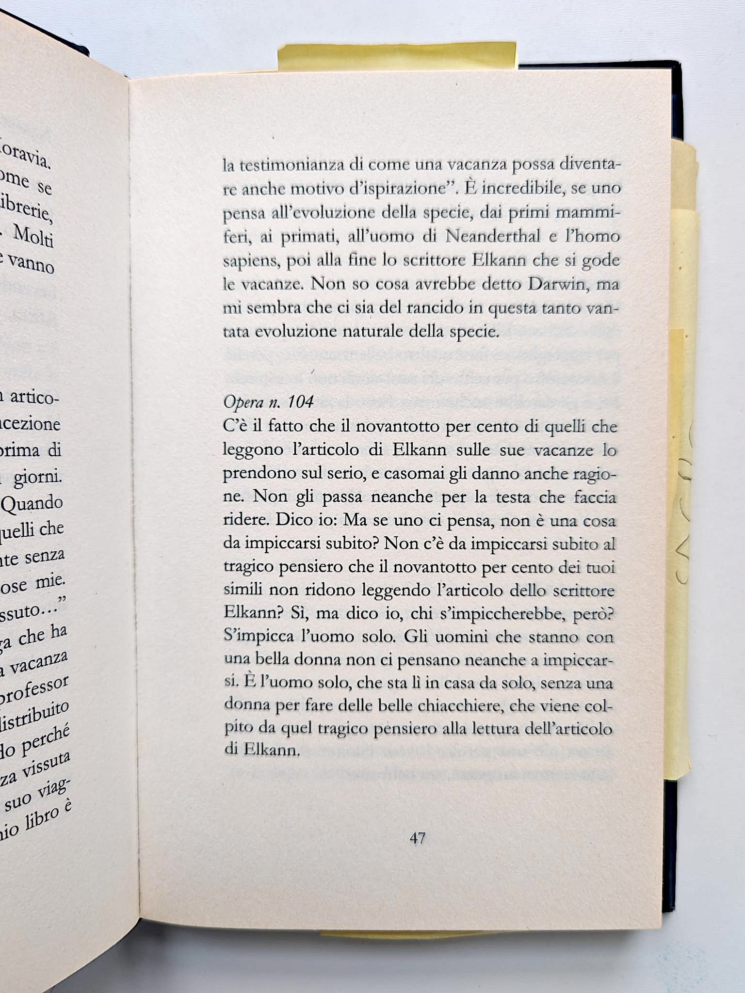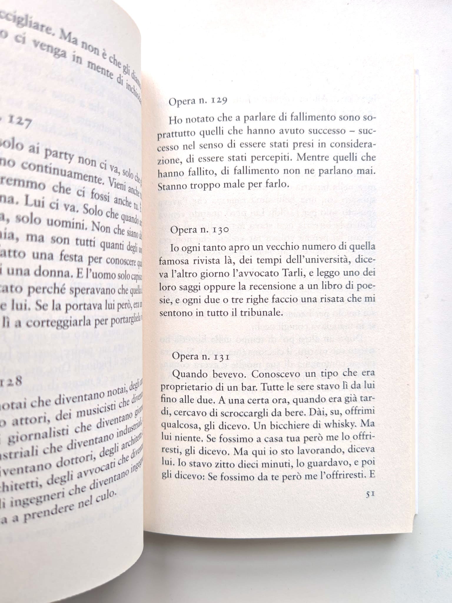 Lo estrai dalla libreria, lo apri, magari a caso, e ti trovi di fronte una serie di smilze opere (si chiamano così, Opere, e sono numerate, cioè Opera n. 1, Opera n. 2, ecc…) che sbalestrano la tua cognizione del mondo. E la sbalestrano per via di una strettissima aderenza con le follie quotidiane; per via di una osservazione così disarmata delle cose o di una auscultazione così attenta dei pensieri che ti vien da pensare che in fondo sia tutto vero.